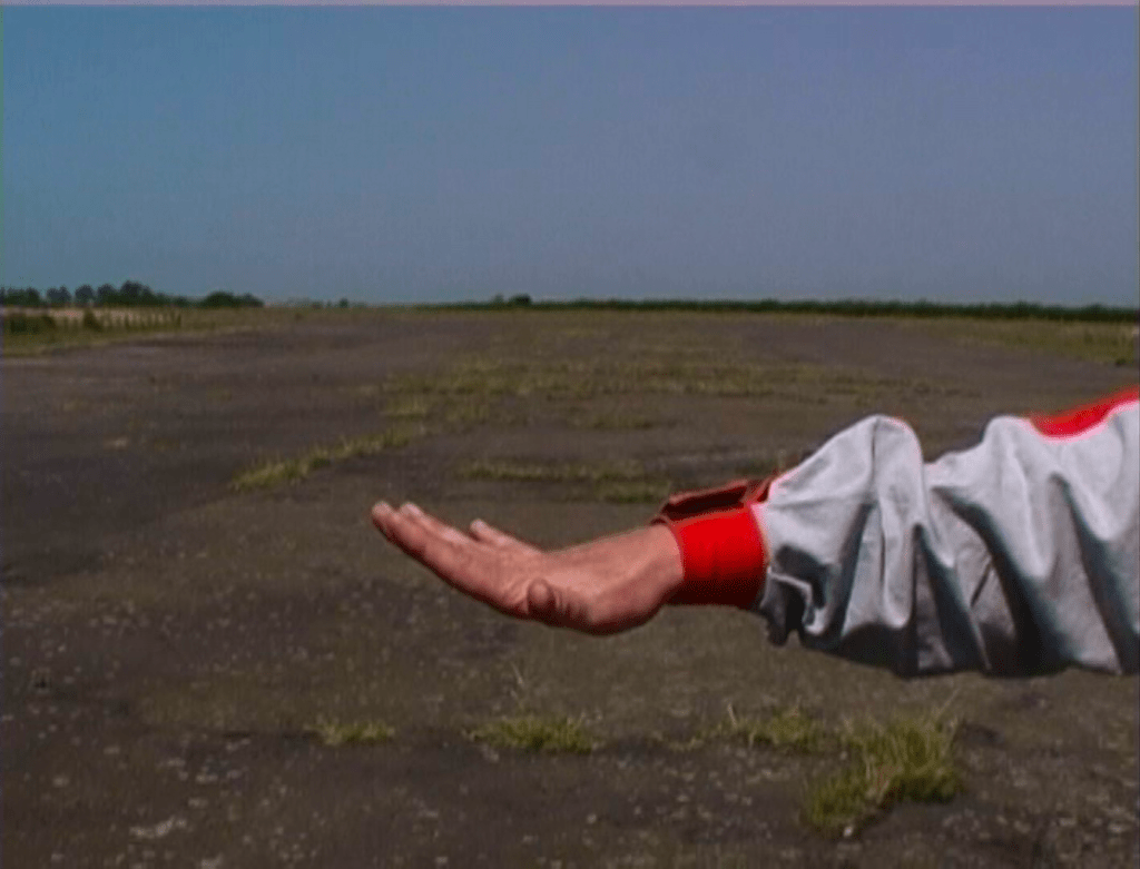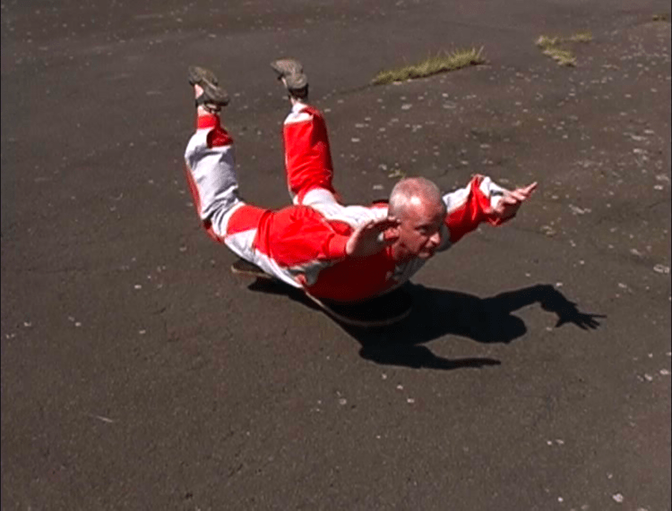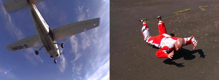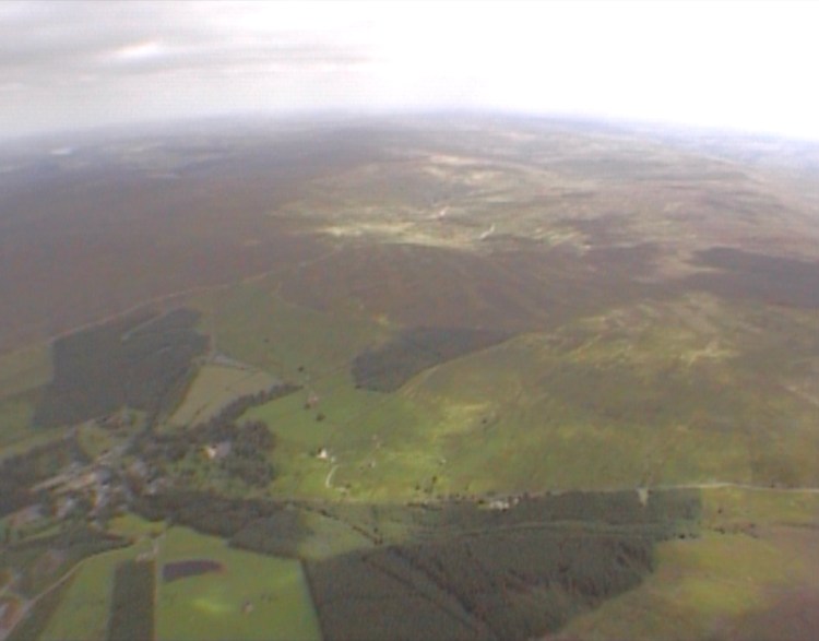 In the skies above Allenheads Contemporary Arts a skydiver, connected to the gallery via live video link, became the vehicle for a cinematic ‘travelling shot’ which traversed the space between the abstracted aerial view of landscape to the lived space of the gallery below. Within the gallery, this live footage, alongside that taken from a small light aircraft, showed aerial views of the Tyne Valley. These images were intercut with those of a parachutist demonstrating the bodily positions necessary for safe skydiving.