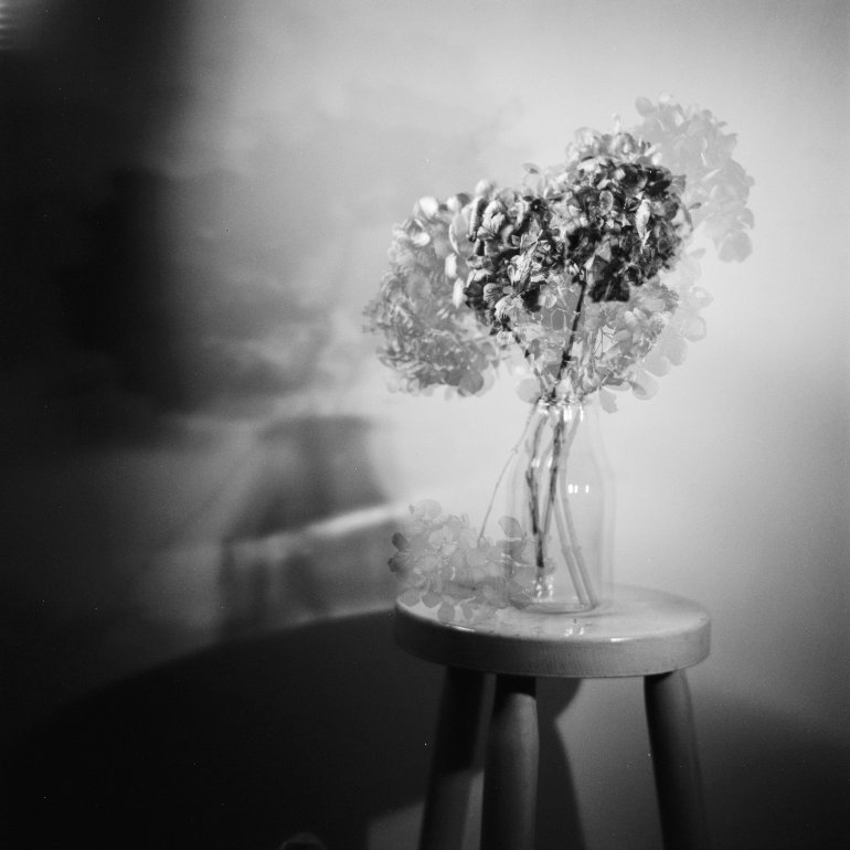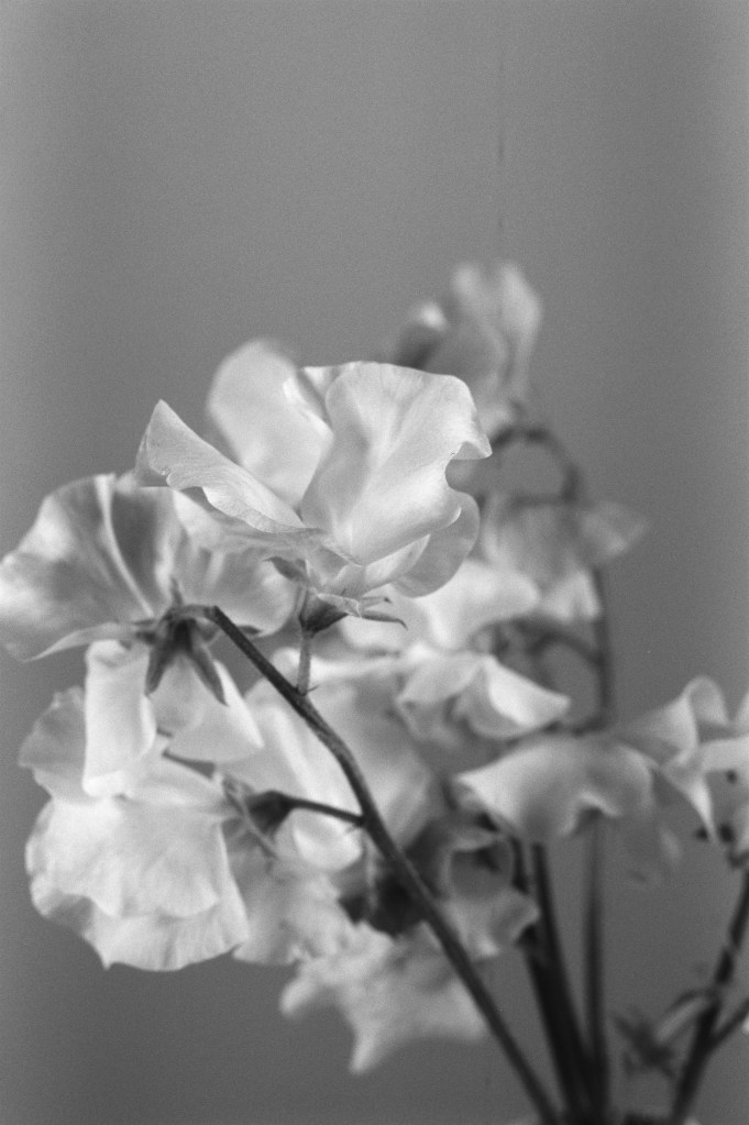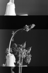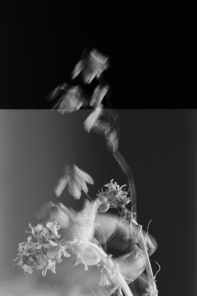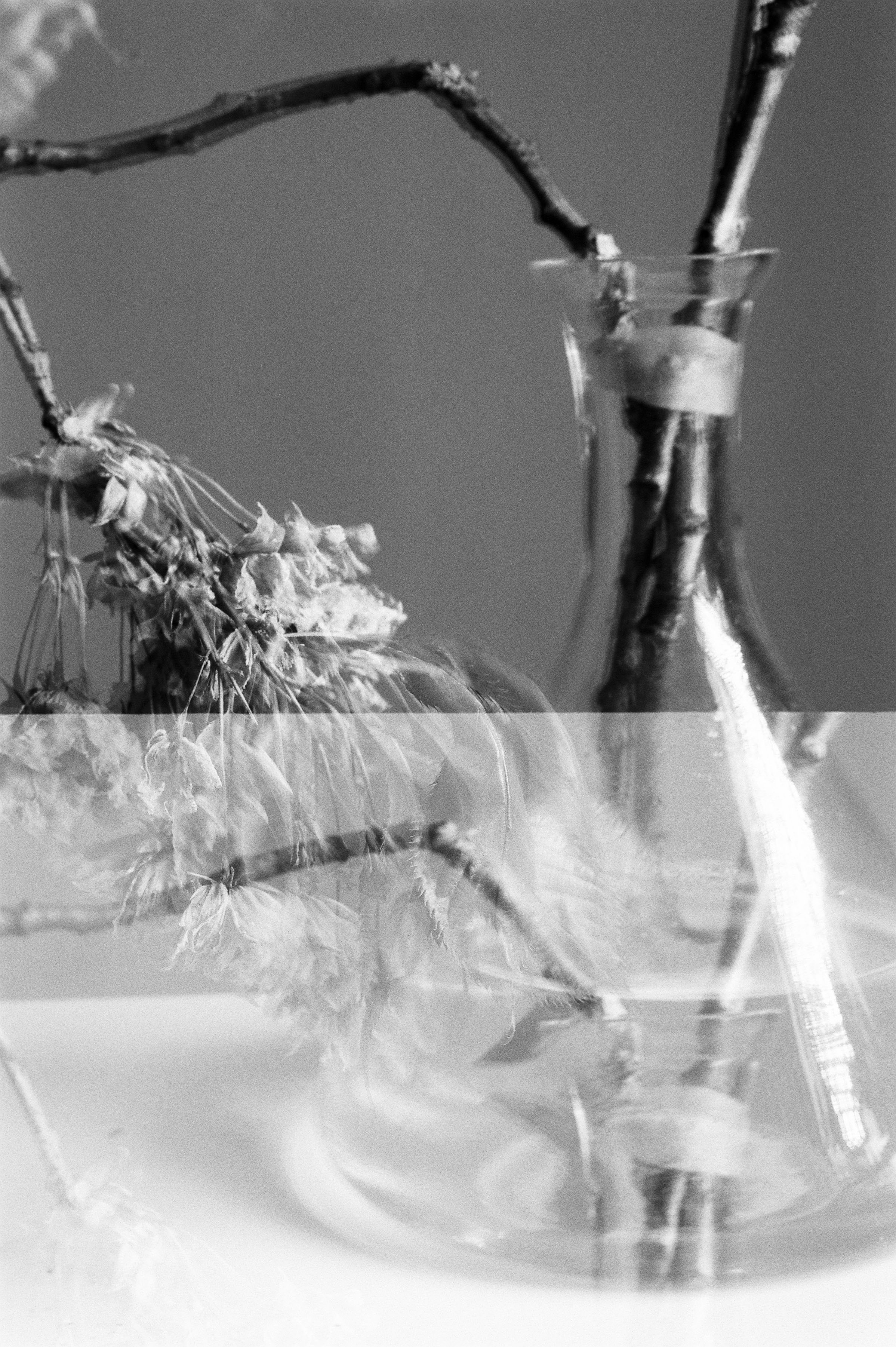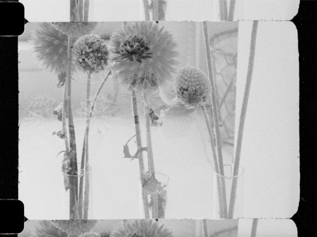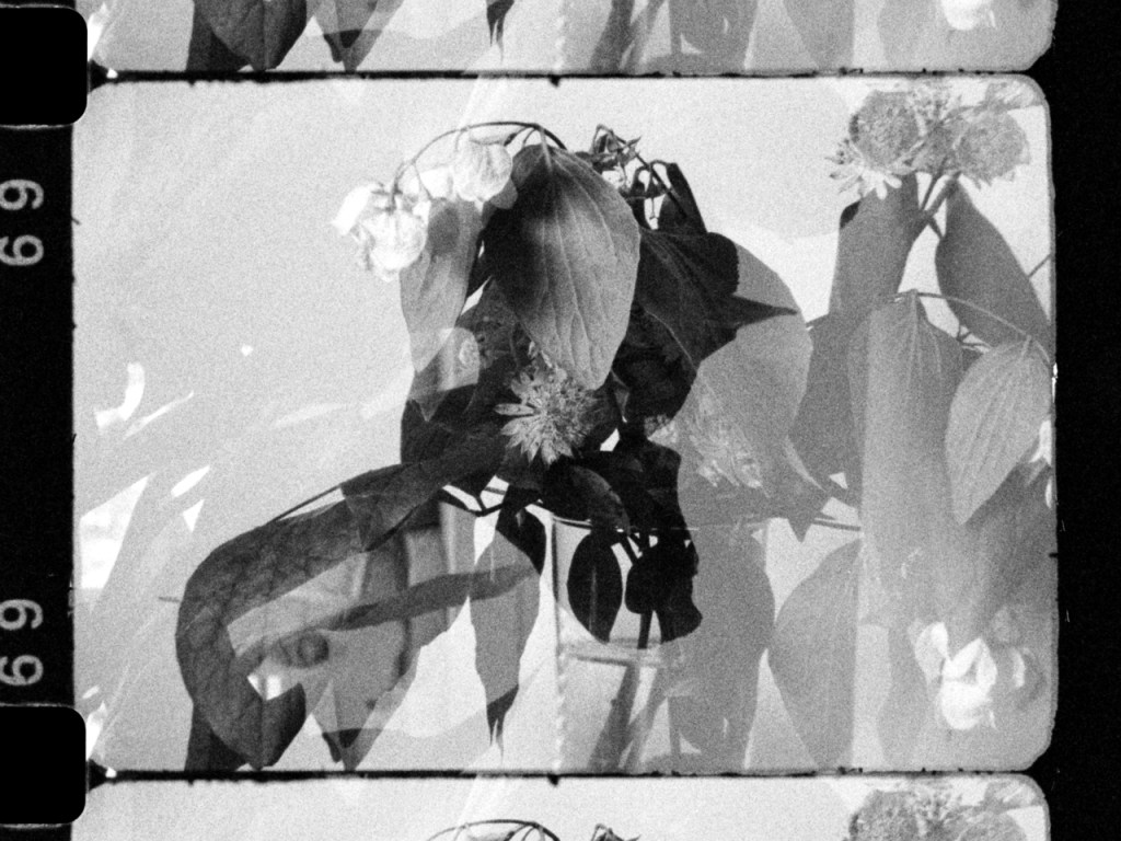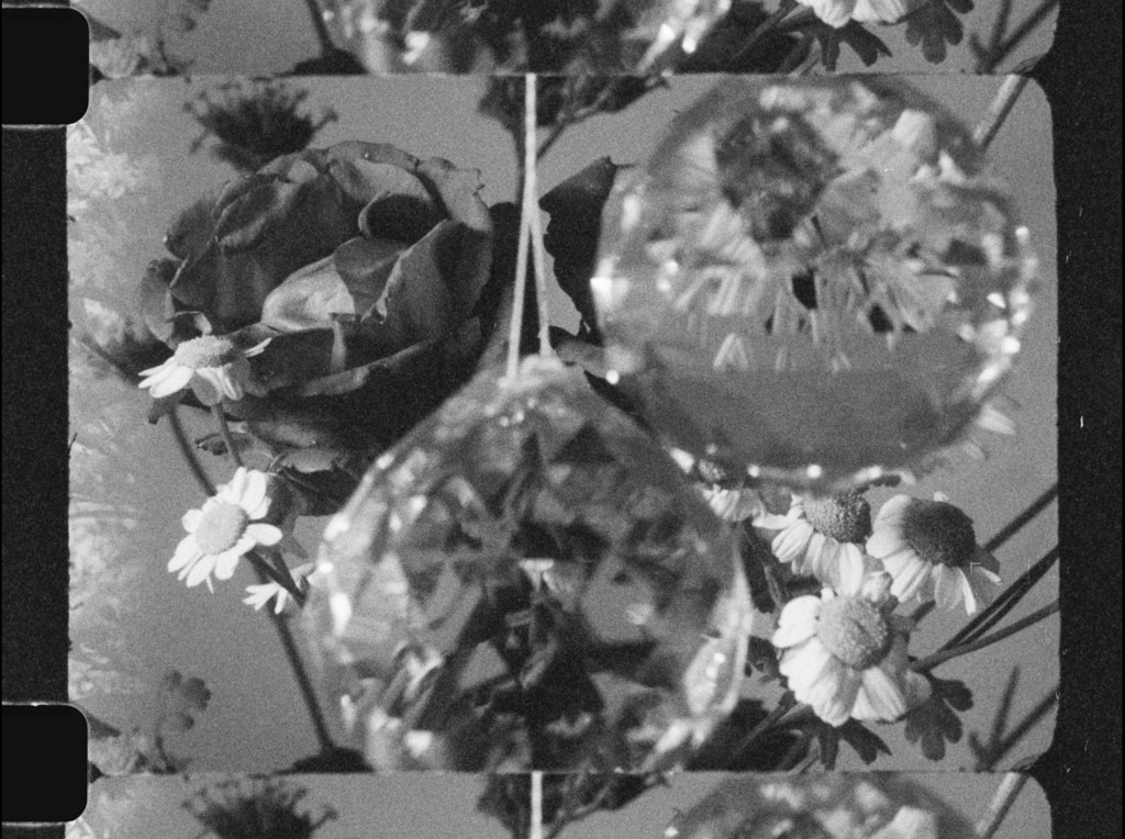 Bouquet (New Hybrids, Black and White), B&W 16mm film, 3 minutes, silent, 2020. In collaboration with Alex Hetherington as part of his larger project Talking, Counting, Blinking, Noting: 16mm film as a collaborative action, 2019-2020. A project made together/apart during lockdown 2020. The 16mm film was passed through the camera first in Glasgow and then a second time in Stirling, registering dislocations in time and space within a single, collaborative, hybrid image.