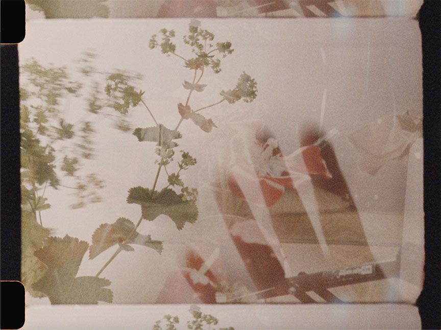 The matte box and the rewindable mechanism of the Bolex camera offer a vehicle for creating multiple exposures, utilizing the materiality of analogue film, which can pass through the camera multiple times. The piece reveals layers of complementary or contrasting imagery through a series of ovoid openings. rough cut botanical is a meditation on perforation; on the many ways in which lives and matter bleed into each other, through stomata, pore, and lens. Featuring both wild and cultivated plants, as well as skin, fur, and other bodily surfaces, the film speaks to the intimate relationships between vegetal and human beings.