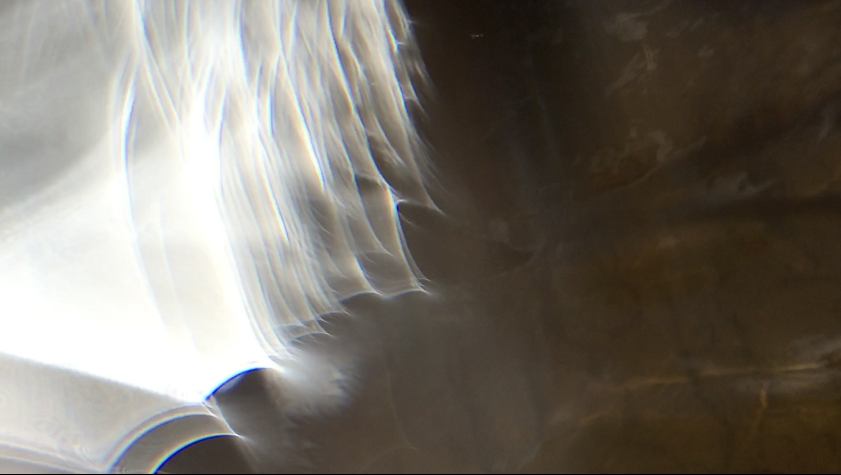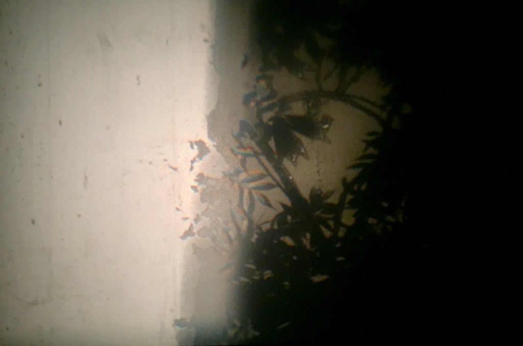 The film is shot using a Bolex camera onto which is fixed a matte box. This device is used to hold mattes: cards with cut-out shapes through which film is exposed. The concertina-like interior of the box is visible in many of the final shots, providing a frame to Kirkup’s images throughout the finished film. As the piece unfolds, light filters in or is blocked entirely, creating sun-spots, shadows, and blackouts within the matte box, adding to the visual rhythm of the work. The slightly dusty folds of the box root the video work within its own processes of making, drawing attention to the materiality of film-making and emphasising the physical roles of light, apparatus, and chemical transformation at the heart of analogue film.