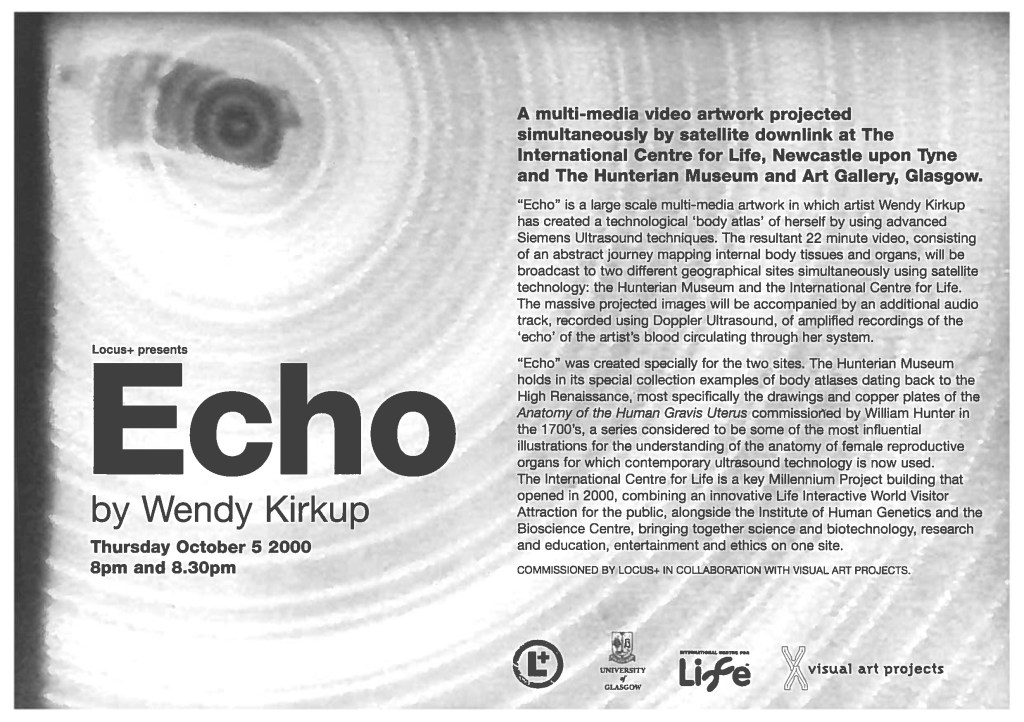 Echo (2000) was a multi-media video artwork projected simultaneously by satellite downlink at The International Centre for Life, Newcastle upon Tyne and The Hunterian Museum and Art Gallery, Glasgow.