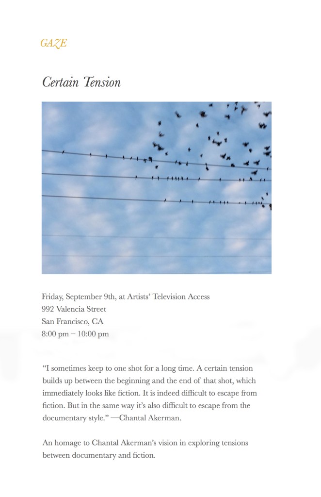 2016 Certain Tension, Artist Television Access, San Francisco. Selected by the Gaze Collective curatorial team, ATA Programming, Mallary Abel Heaton, Adrianne Finelli, Targol Mesbah, Tessa Siddle, Meredith Sward. With films by Lynne Sachs, Ralitsa Doncheva, Luba Drozd, Markus Kiem & Beate Hecher, Fiamma Montezemolo.