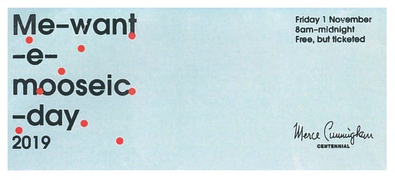 2019 Mewantemooseicday, a day-long celebration of John Cage and Merce Cunningham developed in collaboration with the University of Glasgow, The Glasgow School of Art, and Dance Studio Scotland at Clyde College. Producer Victoria Miguel