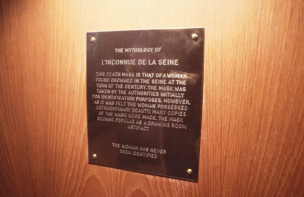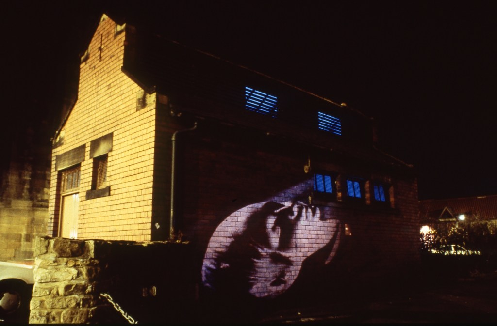 L’Inconnue de la Seine(1991) was a 24-hour slide projection on to the side of a small mortuary situated on the banks of the river in Newcastle upon Tyne. The work drew upon the story of L’Inconnue de la Seine, a death mask reputedly cast from the face of an unknown woman who drowned in the river Seine in Paris, in the late 19th century. The cast was mass produced for public consumption in the 20th century, while also becoming the inspiration behind many works of art and literature.