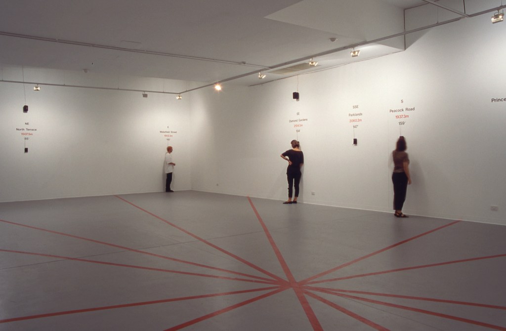 Within the Experimental Art Foundation 16 radio receivers were placed on the walls around the gallery indicating the positions of the wind rose within the city plan, and in relation to the position of the gallery itself. The receivers were tuned to a dedicated FM station airwave which continually broadcast female voices singing a selection of operatic arias. Within the gallery 8 dedicated speakers played a soundtrack of two recorded female voices humming single notes derived from these arias which blended and merged with the radio broadcasts throughout the space.