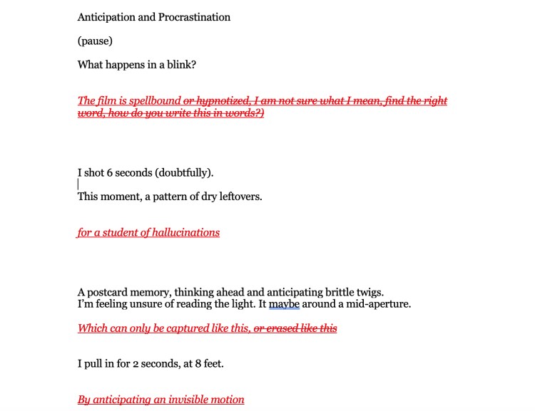 Transient objects, senses and subjects disappearing in seasonal time, moving to memory in living light. Birds, flowers, tides, smoke, trees, wings, heat, rain, skin and fur. Closing the dowser or shutting the len’s aperture favors a camera’s optics over the raw sight of the human eye. In my experience this is often a challenge, especially with early career film practitioners who don’t want to leave anything to chance and who put too much trust or rely on sight on their subject as experienced in real time.